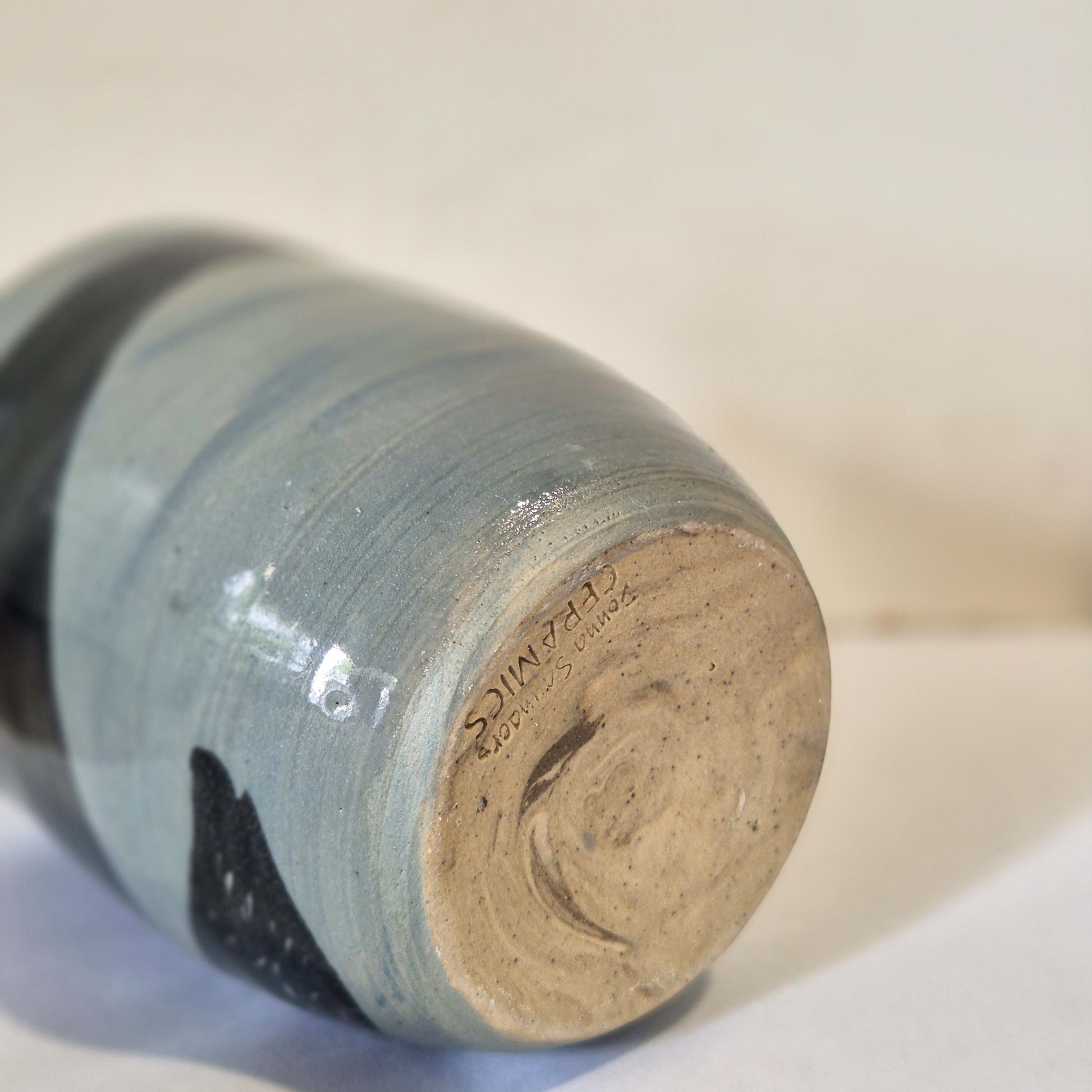 This tumbler has been made by me, in my shed/studio in Bunya Qld using a mix of reclaimed clays. It was made on the wheel, dried a bit, trimmed, coloured, painted, carved, fired, glazed and fired again.