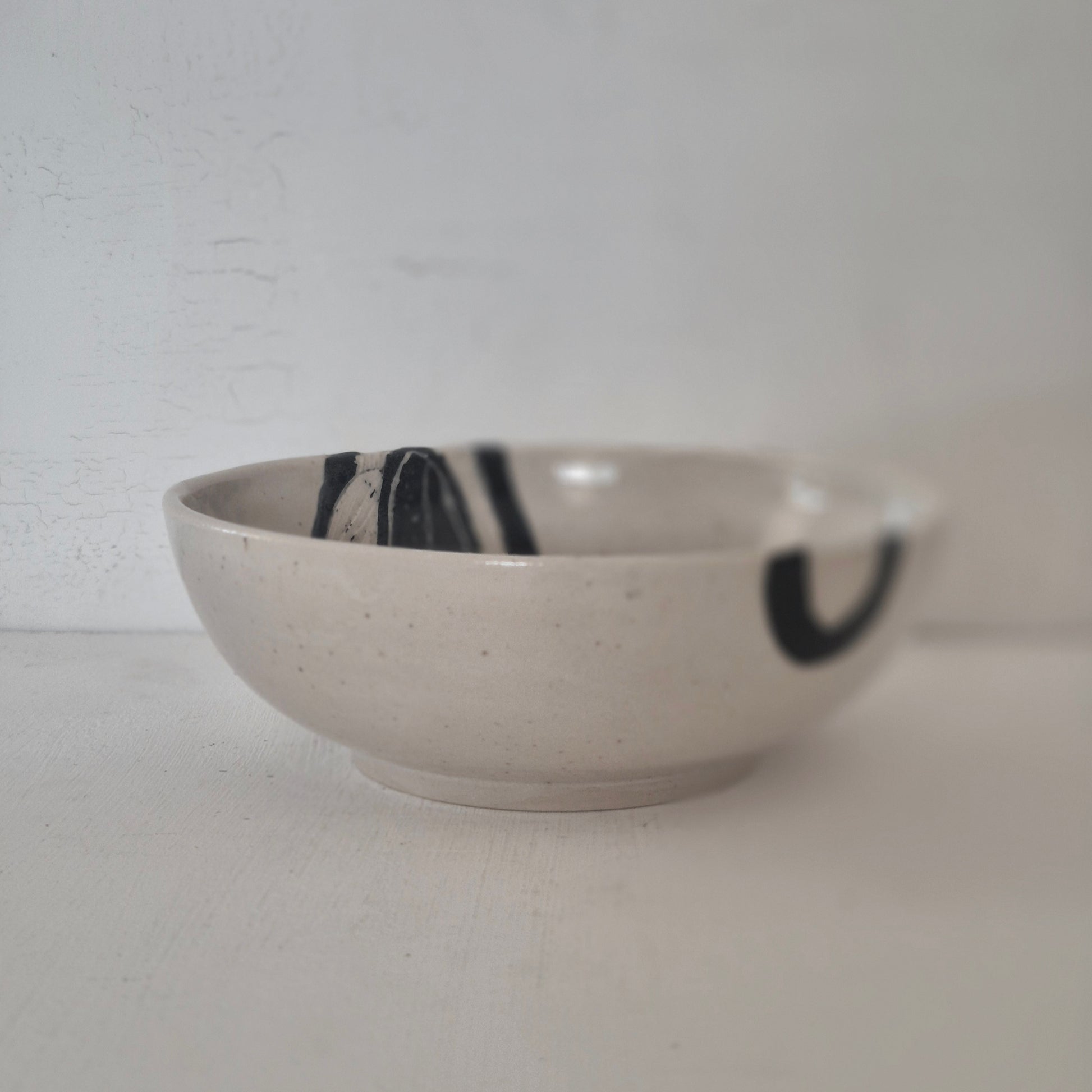 This bowl has been made by me, in my shed/studio in Bunya Qld. It was made on the wheel, dried a bit, trimmed, coloured, carved, fired, glazed and fired again.