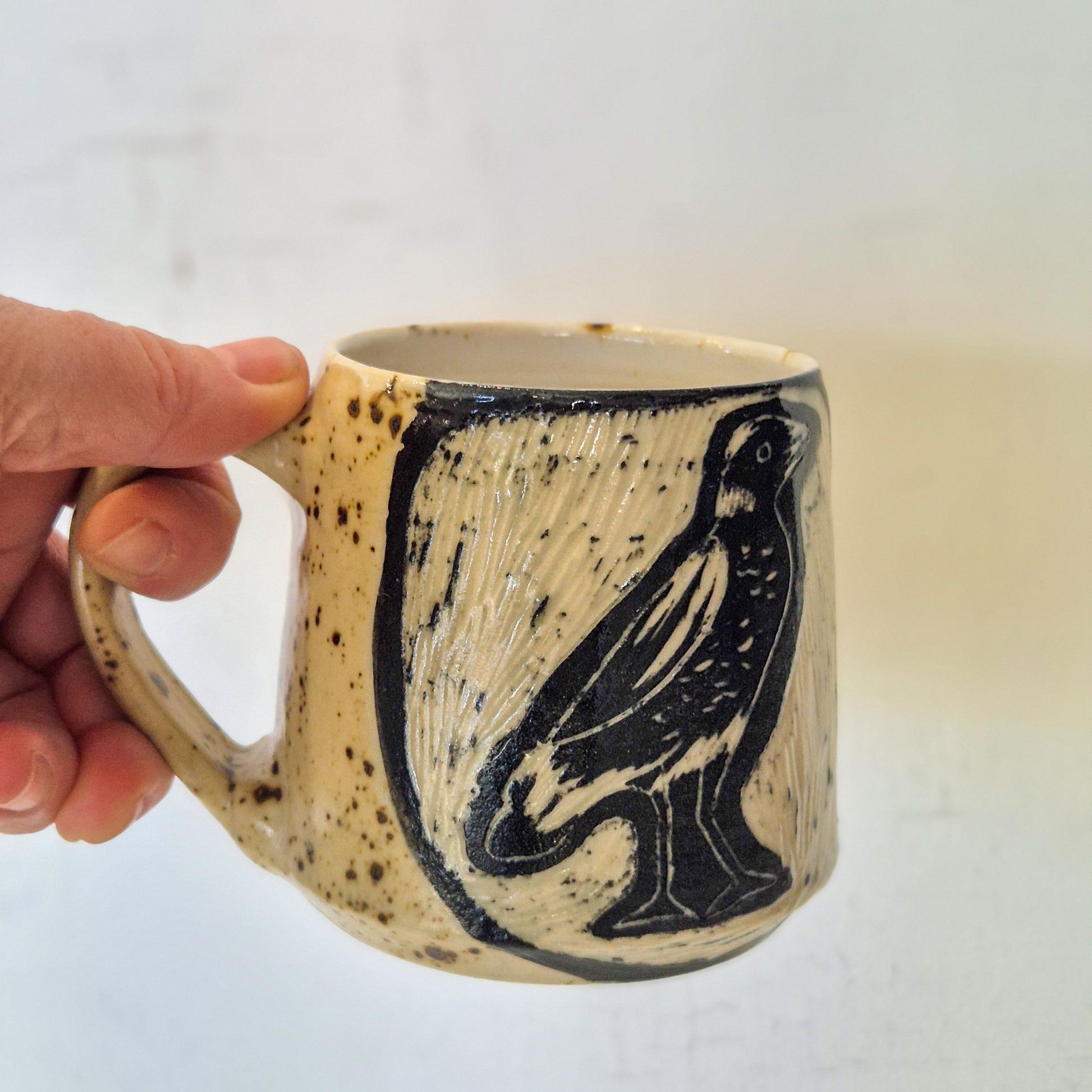 This mug has been made by me, in my shed/studio in Bunya Qld. It was made on the wheel, dried a bit, trimmed, handled, coloured, carved, fired, glazed and fired again.