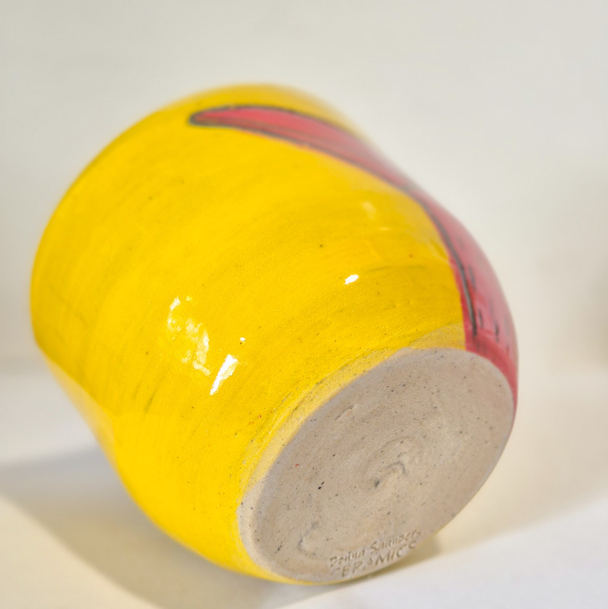 This tumbler has been made by me, in my shed/studio in Bunya Qld using a mix of reclaimed clays. It was made on the wheel, dried a bit, trimmed, coloured, painted, carved, fired, glazed and fired again.