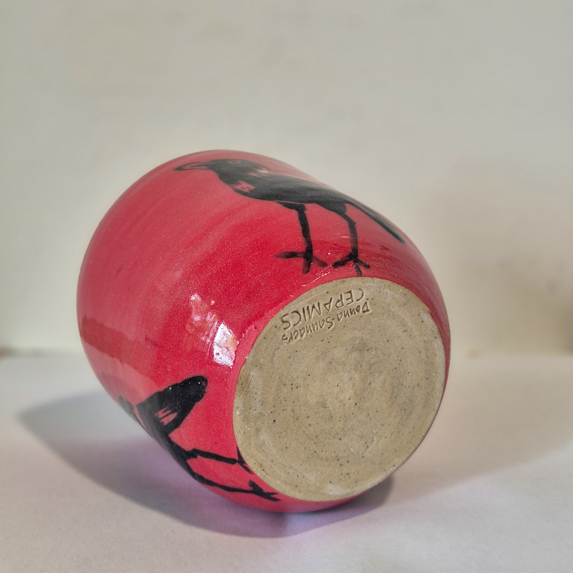 This tumbler has been made by me, in my shed/studio in Bunya Qld using a mix of reclaimed clays. It was made on the wheel, dried a bit, trimmed, coloured, painted, carved, fired, glazed and fired again.